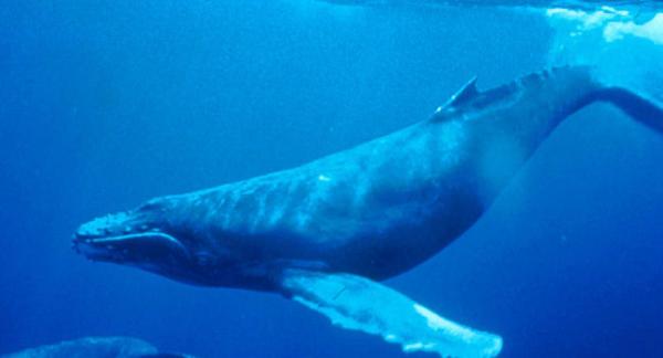 Features: Black or grey with light underside. Distinctive rows around head. Grooves or pleats on underside of throat & chest. Dorsal fin has a small triangular shape. White patterns are found under their scalloped edge flukes. Flippers are long, tapering and wing-like, usually white below.
