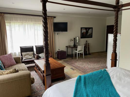 This is a luxury unit with a king/queen size four-poster bed, en-suite bathroom with corner bath and shower, lounge area with sofa and comfortable chairs, workstation, flat screen television with Netflix, kitchenette, microwave oven, fridge, espresso machine and tea making facilities.