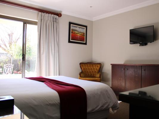 Single or Double Room features a queen-sized bed, en-suite bathroom (bath/shower combination), air-conditioning, flat-screen TV (Netflix), free Wi-Fi, tea/coffee, bar fridge, and private patio. Enjoy a hearty full continental breakfast to start your day.
