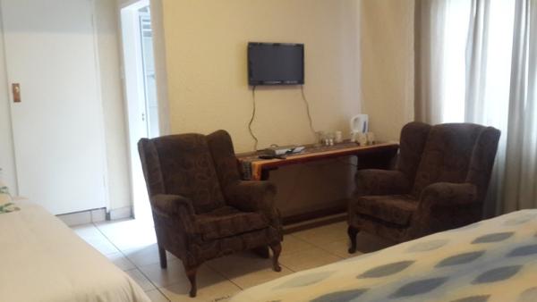 The double bedrooms have a double size bed, comfy chair, television with DSTV (Hotel package), WiFi Internet access and tea and coffee making facilities. Private entrances and own en-suite bathrooms. The room is decorated in subtle African colors, breaking the stark white hotel look. Guest rooms are located in the back of these huge premises, where it is quite and peaceful - listen to the sound of waterfalls at night or enjoy looking at the beautiful 80 year old Chamfer tree.