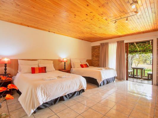 Features two queen beds, en-suite shower, desk, vanity, smart TV, bar fridge (not stocked), and a patio with garden and game views. Includes tea and coffee station and free Wi-Fi.