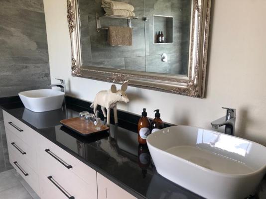 The lodge consists of three en-suite bedrooms; two with king beds and one queen bed. Two bedrooms open onto the patio with a view of the ‘spruit’ small river. The lodge has a central area with lounge, bar, dining area and open-plan kitchen with separate scullery, pantry and courtyard. Air-conditioning and fans are provided throughout.