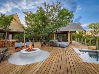 A delightful exterior will beckon you to sit and relax on the veranda at the table. Enjoy the charm of the plunge pool in summer, comfortable loungers and open-to-the-call-of-the-wild outside shower, warm your feet by the fire at the braai/fire pit area in winter, and revel in the sound of giraffe, wildebeest, zebra or nyala as they rustle in the surrounding bush in the dark of night to the occasional call of lions from nearby Balule.