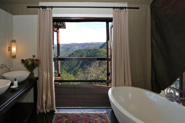 Camp Figtree`s infinity pool is magnificently positioned on the edge of a cliff where the land drops away to the valley below, offering breathtaking views onto mountain slopes.