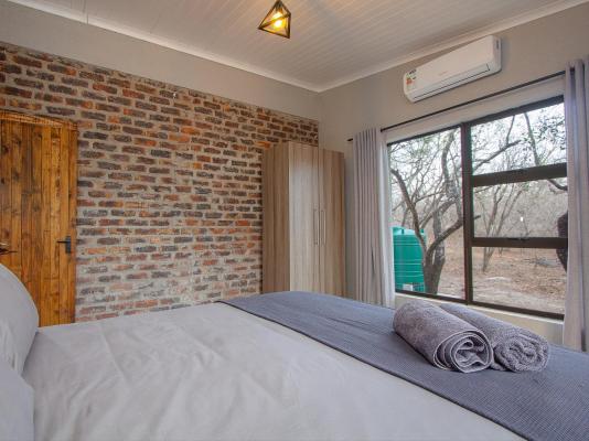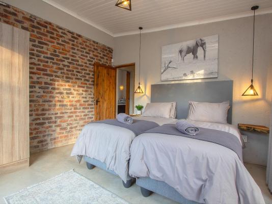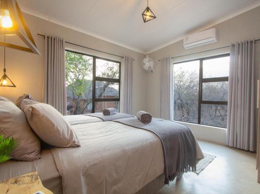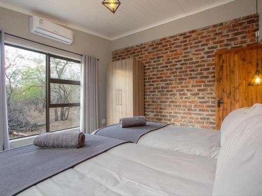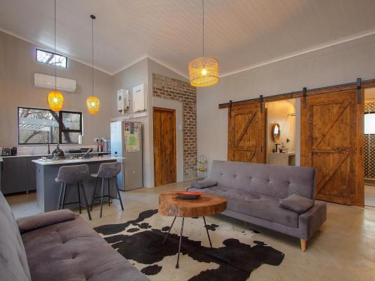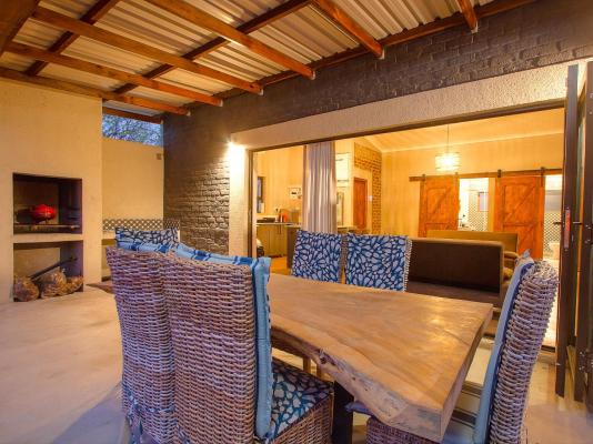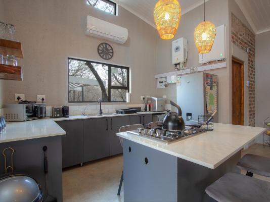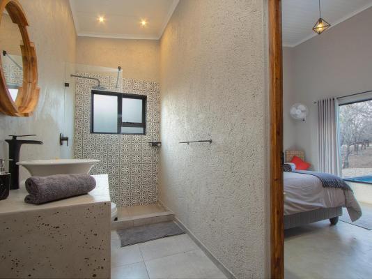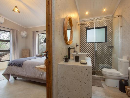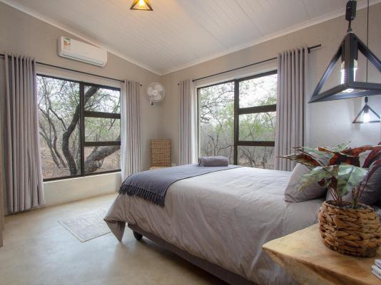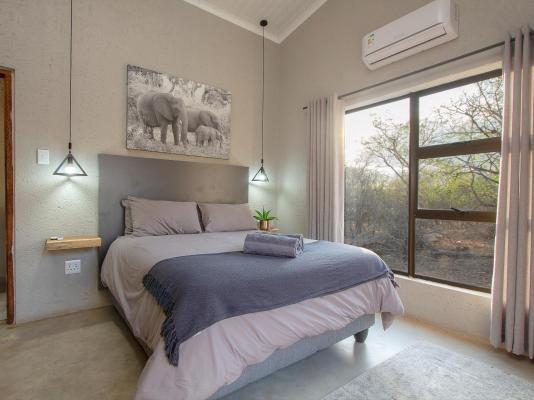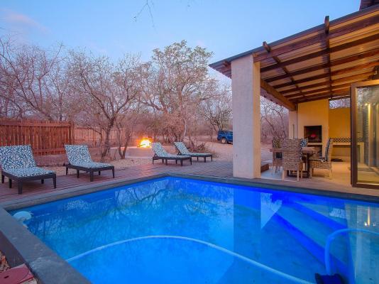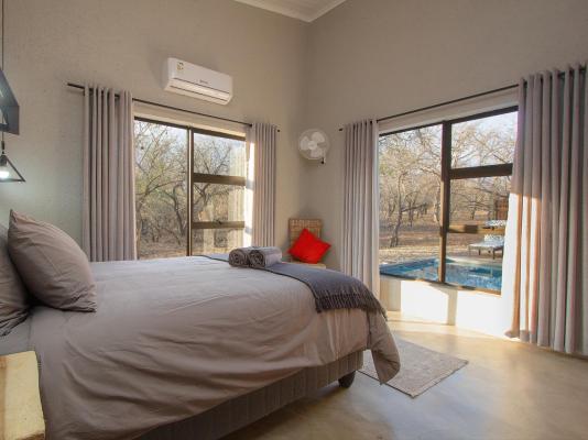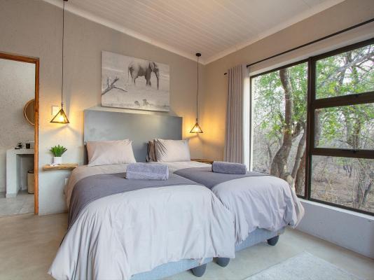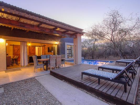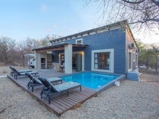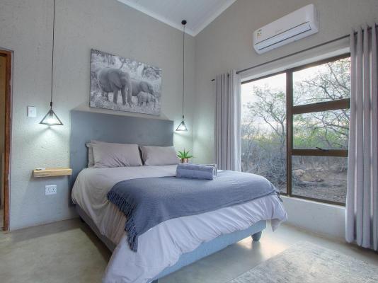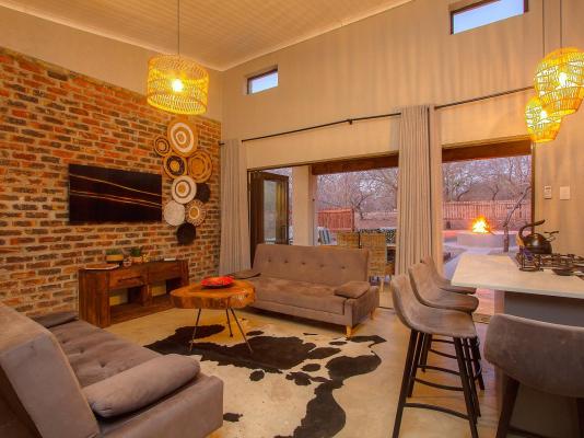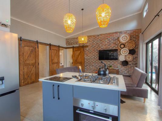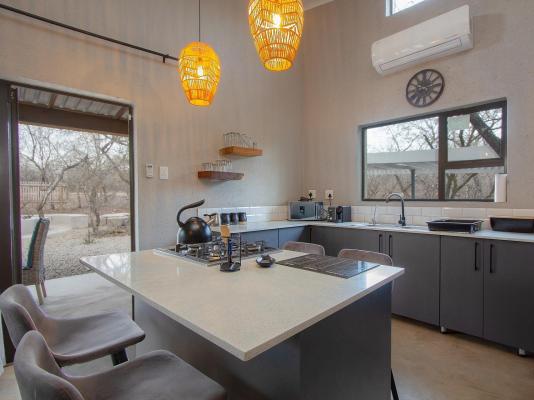 Large glass doors frame sweeping views of the surrounding bush, and a private plunge pool and outdoor dining/braai area invite you to unwind while wildlife roams freely nearby. Inside, the fully equipped kitchen makes self-catering a pleasure, and modern amenities such as Wi-Fi and comfortable furnishings ensure your stay is effortless.
