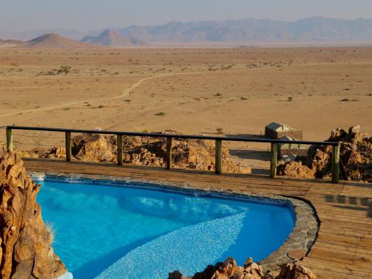 We suggest that you treat yourself to a laidback lunch at the lodge with a bottle of fine South African wine from our extensive range, handpicked by the owners. In the afternoon you can unwind at the lodge or return to the camp to enjoy the magnificent vistas, both from your tents’ deck or the pool deck on the mountain side. Take a drink at our pool bar and recline to marvel at the sun-drenched desert plains. You might also opt for the scenic drive with spectacular views overlooking the vast gravel plains contrasted with the Tsaris and Naukluft mountain massifs of the Namib Desert.