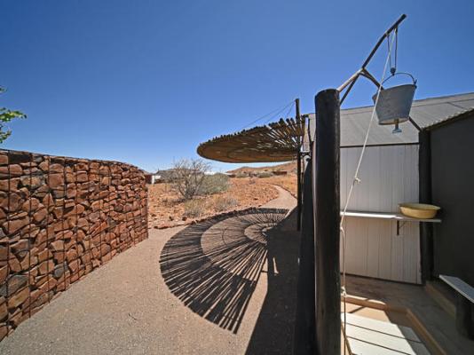 EMC is situated 18km north of Palmwag Lodge on a rough 4x4 track, approximately in the centre of the 50 thousand hectare Etendeka Tourist Concession. The Etendeka Concession Area includes the semi-arid area between the eastern and northern watershed of the Grootberg range of mountains, which is part of the western escarpment, and the Sesfontein road in the south and east, and is placed roughly in the central west of Kunene Region. Etendeka Mountain Camp has been operating for 21 years and in February 2012 Etendeka Lodge Company entered into a 20 year joint venture agreement with the Omatendeka and Anabeb Conservancies for the lease of the concession and the rental of fixed assets that belong to the conservancies. The land is state land but is also communal land and accessible as controlled marginal grazing area for communities to the north.