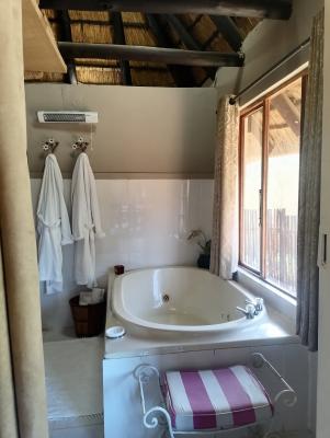 Large studio stand-alone thatched cottage sleeps 2 in Queen bed and 2 on 2 sleeper couches. Hairdryer, electric blanket, goose down duvet, hospitality package, bar fridge, kettle, toaster, microwave, DStv bouquet, en-suite shower & a spa bath with views.