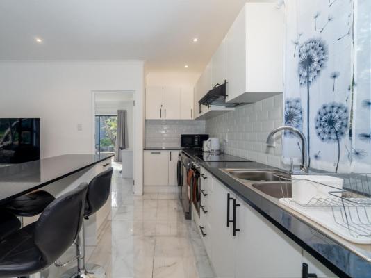 The guest house offers accommodation in king and queen rooms that can each accommodate between 2 and 3 guests. Each room contains a work desk, a Smart Android TV, DStv, Showmax, Netflix and fibre Wi-Fi are included. Some of the rooms have a three-quarter sleeper couch. Guests have shared use of a communal dining area, a lounge with a TV with DStv, and a fully equipped kitchen that is fitted with a fridge-freezer, stove and oven, microwave, kettle, toaster, deep-freezer, and a washing machine. The home has a large garden, swimming pool, braai facilities, and a pool deck with outdoor furniture. Secure parking is available.