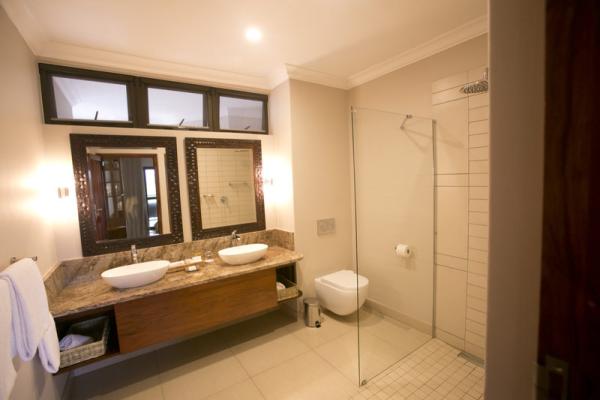 The Twin Deluxe Rooms at this Vic Falls lodge have two three-quarter beds and an en-suite bathroom with a walk-in shower. The bathrooms have his and her basins. The Double Deluxe Rooms have one King-size bed and an en-suite bathroom with a walk-in shower. The bathrooms have his and her basins.