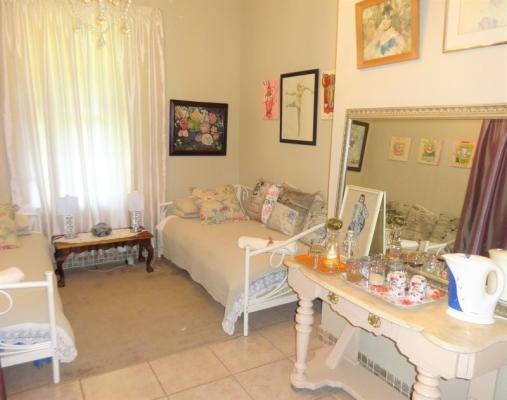 This is the largest room in the house, with 4 poster bed, desk and a lounge. The room is in the front part of the house and is decorated with paintings and other artwork giving it a Bohemian feeling. Some people refer to the decor as "Boere Barok".