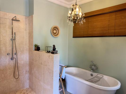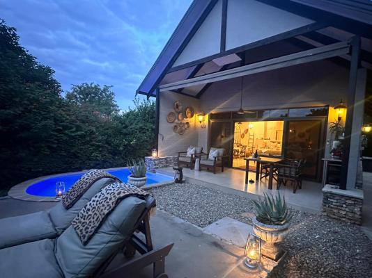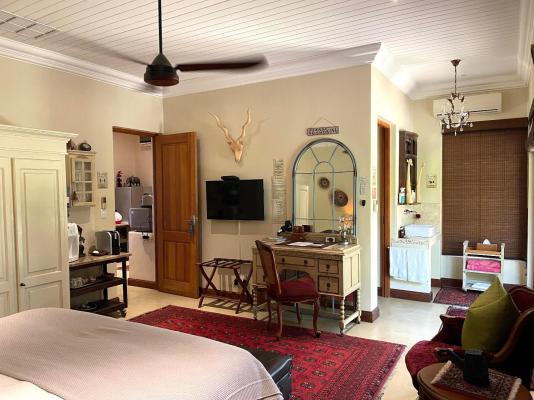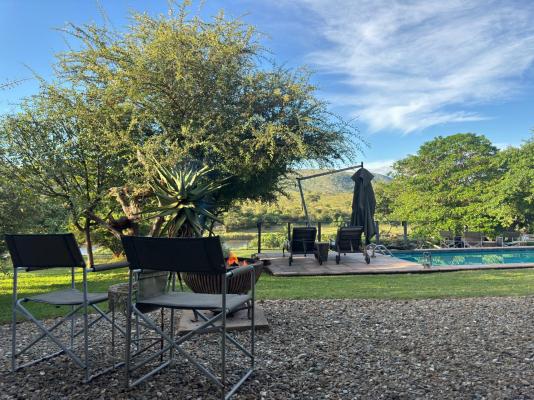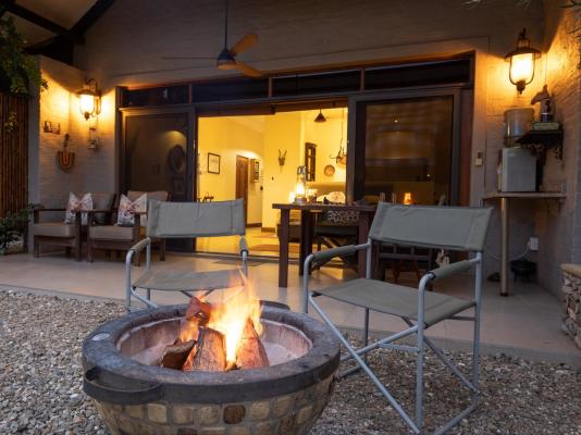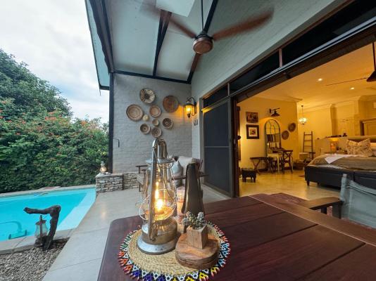 Sleeps 4, Garden View, bathroom en-suite, 2nd bedroom, shower, toilet and basin. Percale Linen, Fans, Air-Conditioner, Tea/Coffee Station,Shares a Pool, Wi-fi, Serviced. Fire-pit, Kichette/Selfcatering, Breakfast and dinners. Lunch can also be ordered.