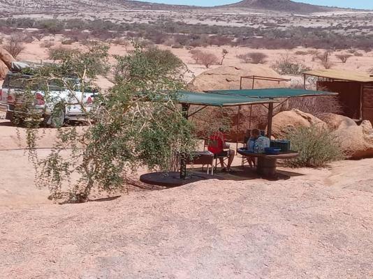 On the banks of the Dry Spitzkoppe River with rocky landscape, panoramic views, and exotic sunset lies a rustic BUSH CAMP. Located about 500 meters outside Spitzkoppe Mountain Reserve. The Spitzkoppe is one of the most photographed mountain motifs of Namibia. This inselberg surmounts its surroundings by 700 metres with an overall height of 1728 m above sea level.