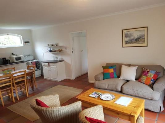 A beautiful bedroom with a double bed, and a full bathroom-en-suite. There is also a spacious lounge and open-plan kitchen. The suite also has DSTV, a vine-covered patio, a swimming pool, and a braai. Elegantly furnished with white cotton linen.