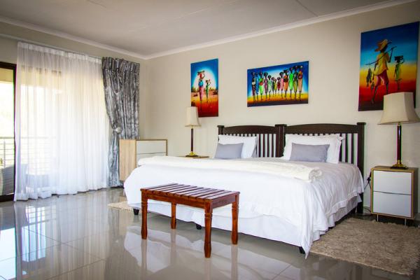 Ultra spacious room with king-size bed. Full en-suite bathroom, own balcony, dressing table/ desk, bar fridge, air-con, flat-screen TV with DSTV, and coffee station. Breakfast is included.