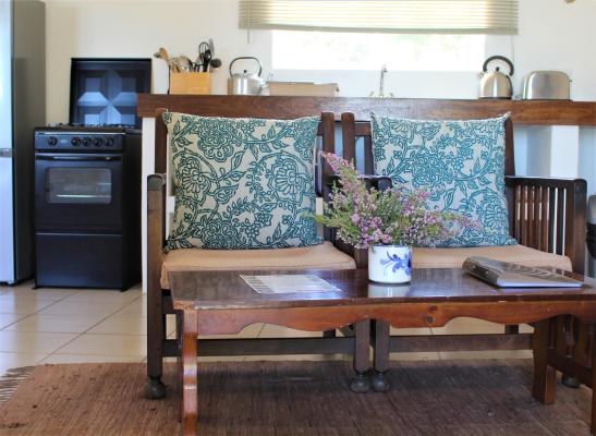 Fully equipped, self-catering cottage, sleeps 6 in two en-suite double bedrooms and two singles in the living area. Indoor fireplace, outside braai (BBQ), a shady porch with mountain water splash pool and views into the Tulbagh valley and mountains.