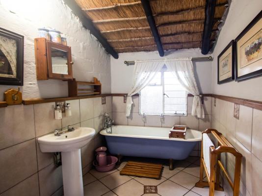 The Bungalow: Rustic! Romantic, cosy, thatched rondavel with island style decor. The rondavel comes with a double bed and an old-fashioned bath in bathroom en suite. Facilities such as fireplace, TV, fan, heater, bar fridge, kettle,and microwave available. With limited cutlery and crockery, the rondavel has an outside mobile braai. A maximum of two guests can be accommodated in this unit.